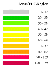 Die folgende Verteilung zeigt die Anzahl der Einwohner mit dem Nachnamen 'Jonas' in den verschiedenen Postleitzahlenregionen Deutschlands (01xxx bis 99xxx).