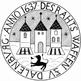 ,,Im schwarzen mit silbernen Rosen bestreuten Felde auf grünem Boden drei verschieden gestaltete Türme nebeneinander, unten kauert ein natürlicher (goldener) Löwe. So das sigillum opidis dalenborg, das um 1500 geschnitten sein dürfte."