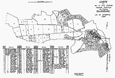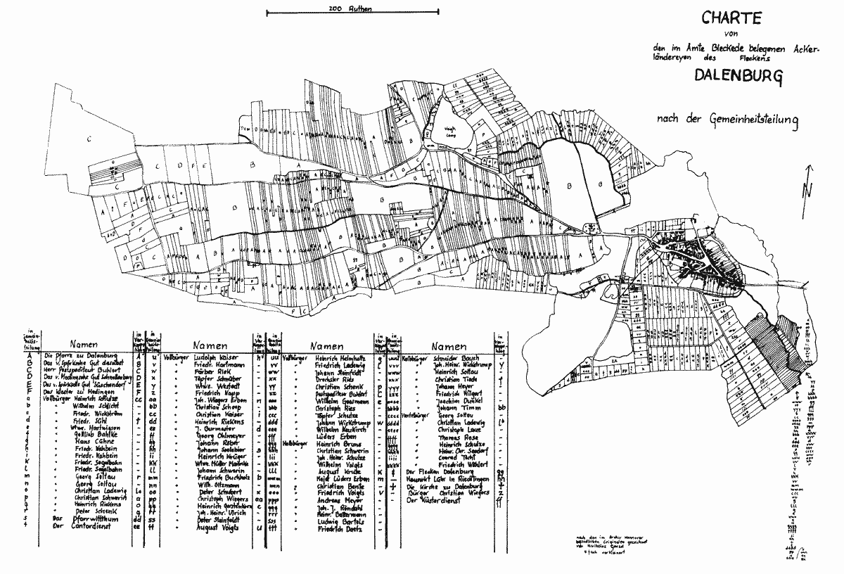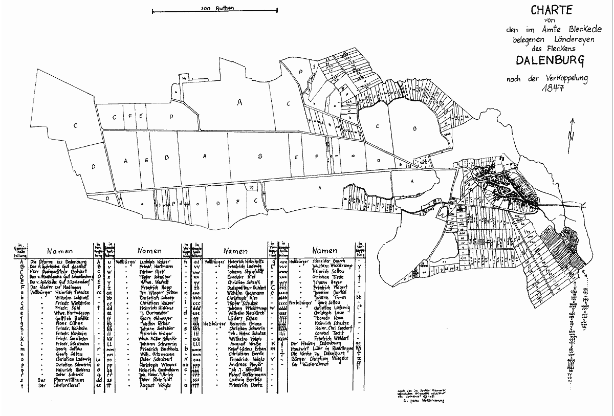 In jener Zeit unterschied man in Dahlenburg Voll-, Halb- oder Viertelbürger. Wie die Vollbürger hatten auch die Halb- und Viertelbürger ihr Bürgerrecht für 2 rth 8 ggr und 8 Pf gekauft. Die Unterschiede bestanden darin, daß die 55 Vollbürgerstellen vollen Anteil an der Allmende hatten, die 21 Halbbürgerstellen 2/3 Anteile und die 8 Viertelbürgerstellen, auch Anbürgerstellen genannt, 1/2 Anteil. Zur Allmende in Dahlenburg gehörten 405 Morgen Weiden, auf die die Bürger ihrem Anteil gemäß ihr Vieh treiben durften. Das Vieh der Häuslinge duldete man auf der Weide, da die Häuslinge keinen Rechtsanspruch besaßen. Die Anteile der Allmende drückte man in Kuhweiden (Khw) aus. 1 Kuhweide ergab die Menge Gras, die eine Kuh fraß, wenn sie Tag und Nacht weidete. 1 Kuhweide ermittelte man auch für 8 Schweine, 8 Schafe (rheinische) und 12 Heidschnucken, während 1 Pferd 2 Kuhweiden benötigte. So gab es auf der Allmende im Jahre 1820 noch 34 Pferde, 52 Kühe, 7 Ochsen, 63 Schweine und 71 Schafe. Diese Statistik kennzeichnete, daß viel zu viel Vieh vor der Teilung auf der Allmende weidete. Für die Dahlenburger Familien war es allerdings wichtig, viel Vieh zu füttern, da nur dadurch die Lebensgrundlage, also ein Existenzminimum gesichert wurde. Als man nach 1820 die Allmende aufhob, und die Weideberechtigten ihre kleinen Weidestücke nutzten, konnten sie nicht mehr so viel Vieh halten und verarmten zusehends. Alle erhielten zwei Grundweiden, die in jeder Bürgerklasse den gleichen Wert hatten: